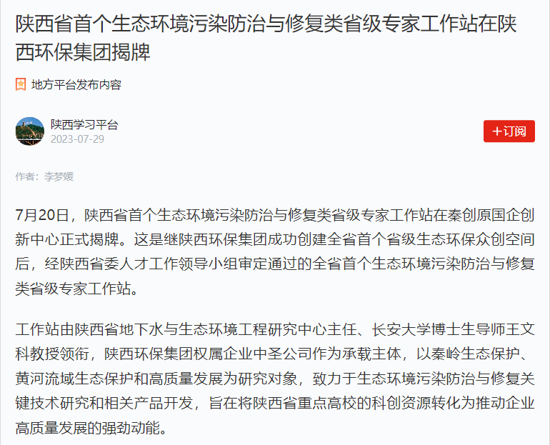 7月29日,學(xué)習(xí)強(qiáng)國平臺(tái)以《陜西省首個(gè)生態(tài)環(huán)境污染防治與修復(fù)類省級(jí)專家工作站在陜西環(huán)保集團(tuán)揭牌》為題,對陜西環(huán)保集團(tuán)成功創(chuàng)建省級(jí)專家工作站等工作開展情況進(jìn)行了報(bào)道,現(xiàn)刊載如下,以饗讀者。