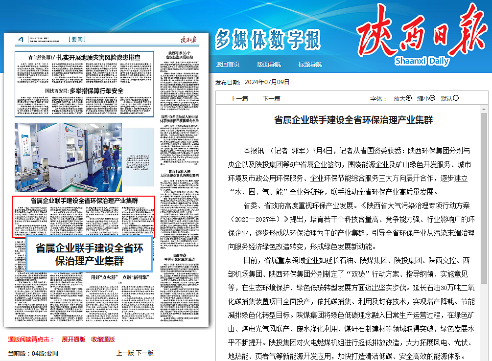 7月9日,陜西日?qǐng)?bào)以《省屬企業(yè)聯(lián)手建設(shè)全省環(huán)保治理產(chǎn)業(yè)集群》為題,對(duì)陜西環(huán)保集團(tuán)舉辦陜西國(guó)企生態(tài)環(huán)保業(yè)務(wù)合作座談會(huì)和服務(wù)全省環(huán)保產(chǎn)業(yè)鏈發(fā)展等情況進(jìn)行了報(bào)道?,F(xiàn)刊載如下,以饗讀者。