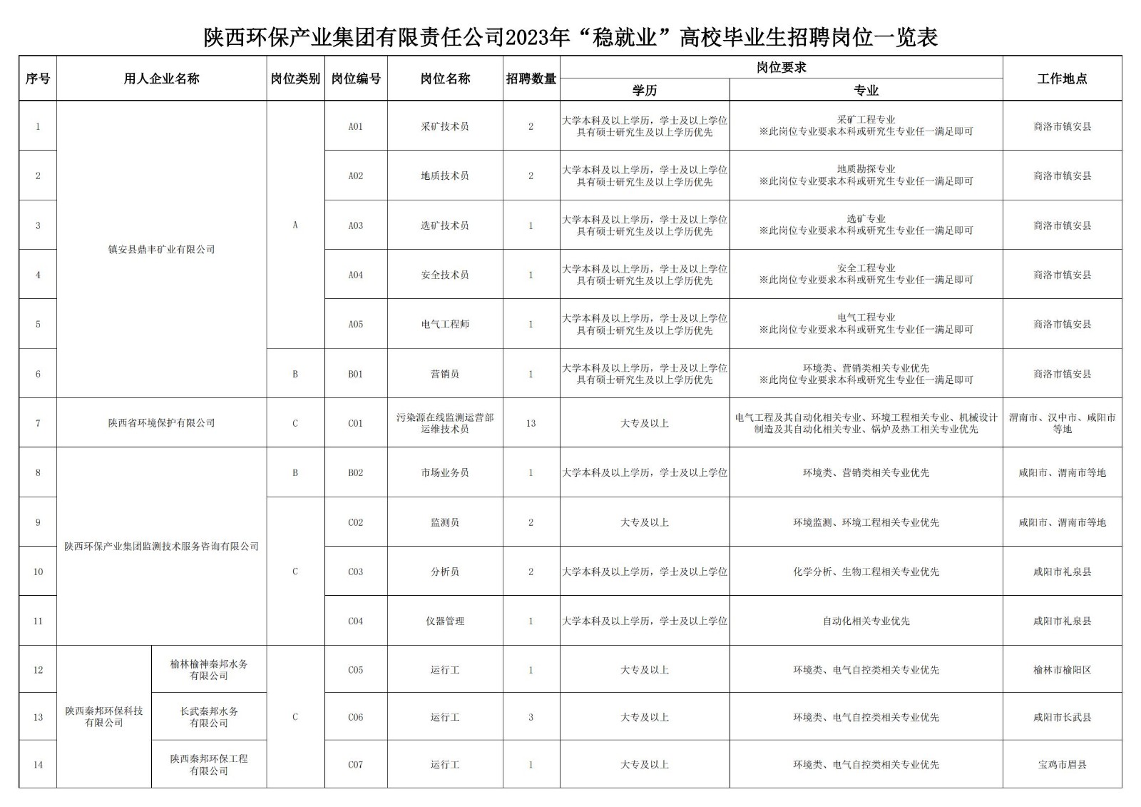 (二)崗位類別 本次招聘3個(gè)類別崗位: 1.A類:專業(yè)技術(shù)類崗位 2.B類:市場營銷類崗位 3.C類:技能操作類崗位 (三)招聘崗位及任職條件: 招聘崗位及任職條件詳見附件;部分崗位須與用人企業(yè)約定同類型崗位服務(wù)年限。 三、招聘程序 本次社會公開招聘按照發(fā)布招聘公告→報(bào)名及資格初審→筆試→現(xiàn)場資格復(fù)審→面試→體檢→公示及錄用等程序進(jìn)行。 (一)發(fā)布招聘公告 1.陜西環(huán)保集團(tuán)官網(wǎng)(http://yushensuo.com) 2.智聯(lián)招聘西安頻道(http://www.zhaopin.com/xian) 3.陜西公共招聘網(wǎng)(http://www.sxggzp.com/) (二)報(bào)名及資格初審 1.公告發(fā)布及報(bào)名時(shí)間:2023年8月18日14:00-2023年8月23日 17:00 2.報(bào)名網(wǎng)站:https://sxhbjtzp.zhaopin.com 3.報(bào)名方式: (1)本次招聘采取線上報(bào)名及資格初審方式,不設(shè)現(xiàn)場報(bào)名,不接受簡歷郵遞、面呈等方式。 (2)應(yīng)聘人員須根據(jù)報(bào)名系統(tǒng)要求仔細(xì)填寫信息,上傳相應(yīng)材料,避免因個(gè)人原因?qū)е聢?bào)名不成功。 4.應(yīng)聘人員在報(bào)名系統(tǒng)中須正確上傳所需資料,具體如下: (1)本人近期免冠正面證件照; (2)身份證正反面或其他有效身份證件掃描件; (3)所有學(xué)歷證、學(xué)位證原件電子版(國(境)外學(xué)歷須上傳教育部留學(xué)服務(wù)中心認(rèn)證的《國內(nèi)外學(xué)歷學(xué)位認(rèn)證書》); (4)招聘崗位任職條件要求的其他證明材料掃描件。 5.A類崗位原則上采用筆試與面試相結(jié)合的方式進(jìn)行考核;B類、C類崗位原則上采用面試方式進(jìn)行考核,具體考核方式以實(shí)際情況為準(zhǔn)。 6.其他要求: (1)資格初審上傳資料與填報(bào)的報(bào)名信息須保持一致,若其中一項(xiàng)不符合報(bào)考崗位所需要求,視為線上資格初審不通過; (2)應(yīng)聘人員相關(guān)材料必須真實(shí)可靠。因報(bào)名提交資料不真實(shí)、不完整或錯(cuò)誤遺漏,造成報(bào)名無效、資格初審及后續(xù)資格審查不通過等后果的,由應(yīng)聘人員自行承擔(dān)責(zé)任; (3)為確保報(bào)名成功,建議應(yīng)聘人員在PC(電腦)端進(jìn)行報(bào)名操作; (4)資格初審結(jié)果不作為確定符合崗位條件的最終依據(jù),資格審查貫穿招聘工作全過程。凡在招聘工作各個(gè)環(huán)節(jié)中發(fā)現(xiàn)報(bào)考者不符合崗位條件或存在弄虛作假等問題的,一經(jīng)查實(shí),取消報(bào)考(錄用)資格,已經(jīng)錄用的解除勞動(dòng)合同并追究相關(guān)法律責(zé)任。 (三)筆試 1.通過資格初審的應(yīng)聘人員,進(jìn)入筆試環(huán)節(jié); 2.筆試主要考核應(yīng)聘者綜合素質(zhì); 3.筆試時(shí)間、地點(diǎn)另行通知; 4.應(yīng)聘人員須在指定時(shí)間內(nèi)登錄報(bào)名網(wǎng)站下載打印準(zhǔn)考證,未按時(shí)打印準(zhǔn)考證者視為主動(dòng)放棄。 (四)現(xiàn)場資格復(fù)審 根據(jù)筆試成績排名,確定進(jìn)入資格復(fù)審環(huán)節(jié)的應(yīng)聘人員,招聘企業(yè)現(xiàn)場對所提交的資料真實(shí)性進(jìn)行核驗(yàn)。 (五)面試 1.通過資格復(fù)審的應(yīng)聘人員,進(jìn)入面試環(huán)節(jié); 2.面試主要考核應(yīng)聘者專業(yè)素質(zhì); 3.面試時(shí)間、地點(diǎn)另行通知; 4.面試結(jié)束后,根據(jù)綜合成績從高到低確定擬錄用人員。 (六)公示 對擬錄用人員進(jìn)行公示。 (七)體檢 公示結(jié)束后,各用人企業(yè)組織擬錄用人員進(jìn)行體檢,體檢費(fèi)用由擬錄用人員自理。體檢不合格的,取消應(yīng)聘資格。 (八)遞補(bǔ) 如出現(xiàn)應(yīng)聘人員未參加體檢、體檢不合格、放棄錄用等情況,由招聘企業(yè)決定是否遞補(bǔ)。 (九)錄用 對體檢合格的擬錄用人員按有關(guān)規(guī)定辦理錄用手續(xù)。 四、注意事項(xiàng) (一)應(yīng)聘者應(yīng)對本人所填報(bào)資料的真實(shí)性負(fù)責(zé),誠實(shí)應(yīng)聘。對偽造、涂改證件證明,或以其他不正當(dāng)手段獲取應(yīng)聘資格、在考核過程中作弊等違反公開招聘紀(jì)律的應(yīng)聘人員,將取消應(yīng)聘資格,對已錄用人員,一經(jīng)查實(shí),即予解除勞動(dòng)關(guān)系。 (二)本次招聘不指定教材和輔導(dǎo)用書,不舉辦也不委托任何機(jī)構(gòu)和個(gè)人舉辦考試輔導(dǎo)培訓(xùn)班。 (三)應(yīng)聘人員報(bào)名時(shí)須提交能及時(shí)聯(lián)系到本人的電話號碼,以便在出現(xiàn)遞補(bǔ)情形時(shí)聯(lián)系本人。因個(gè)人原因無法取得聯(lián)系造成的后果,由個(gè)人自行負(fù)責(zé)。應(yīng)聘人員報(bào)名成功后,請時(shí)刻關(guān)注公告發(fā)布網(wǎng)站上的有關(guān)資格復(fù)審、考試及其它相關(guān)信息,以免錯(cuò)過時(shí)間節(jié)點(diǎn)。